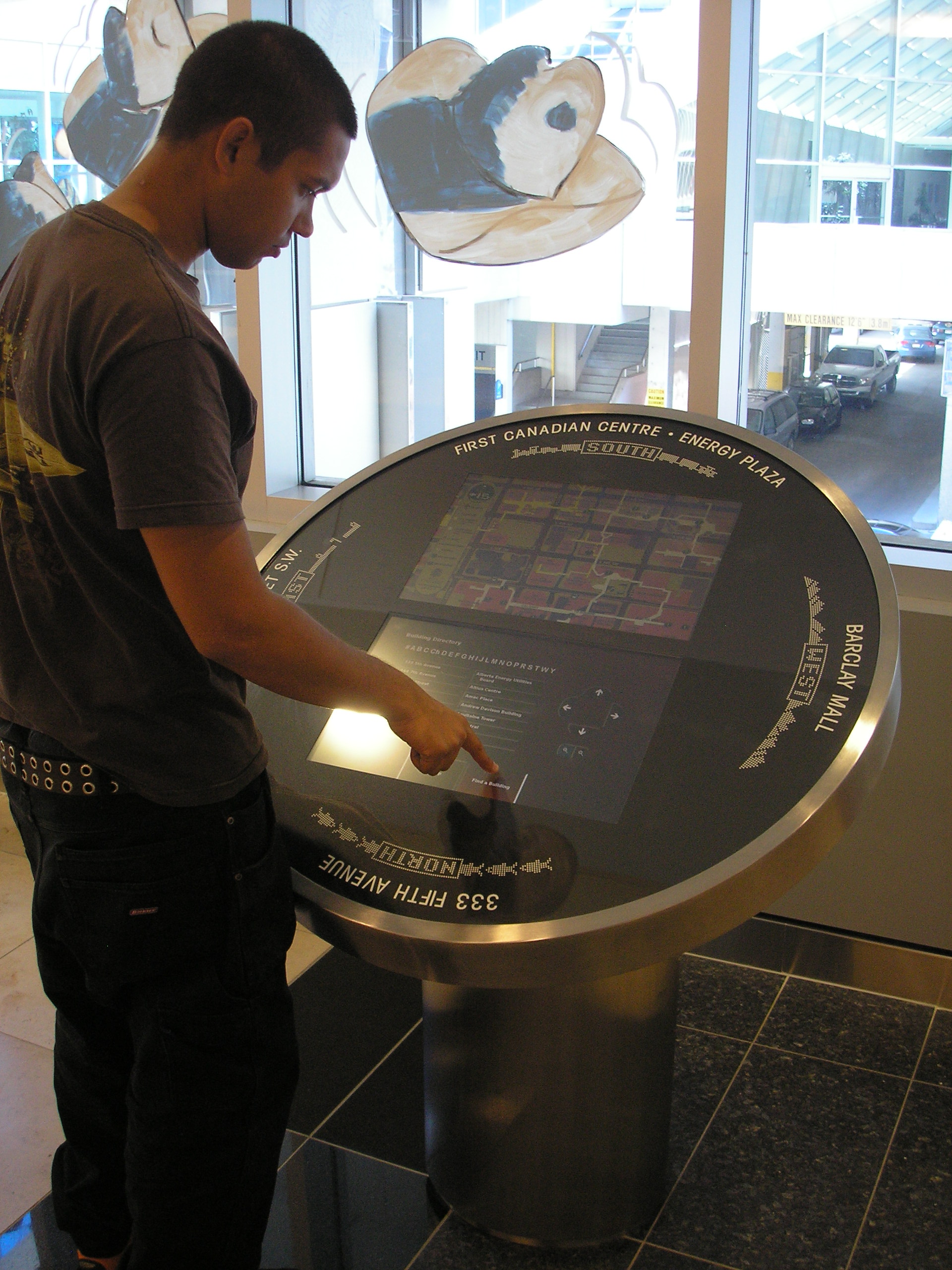 Interactive touch-screen kiosks with dynamic maps to guide users through Calgary's Plus-15 Skywalk labyrinth.